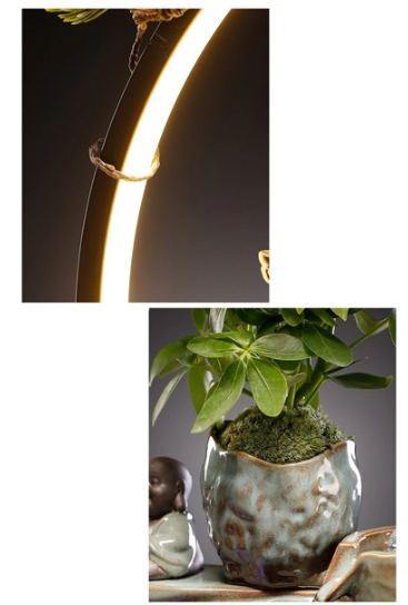 - Chậu gốm sứ được thiết kế với những đường vân chạm khắc hài hòa, có độ bền cao, Tượng Chú Tiểu ngồi an nhiên, Kệ gỗ, Bộ ấm trà và tách trà trang trí, 1 Cây Bonsai nhựa1 vòng bánh xe.