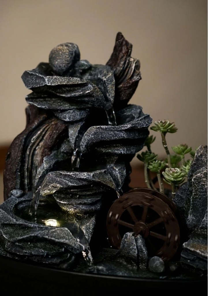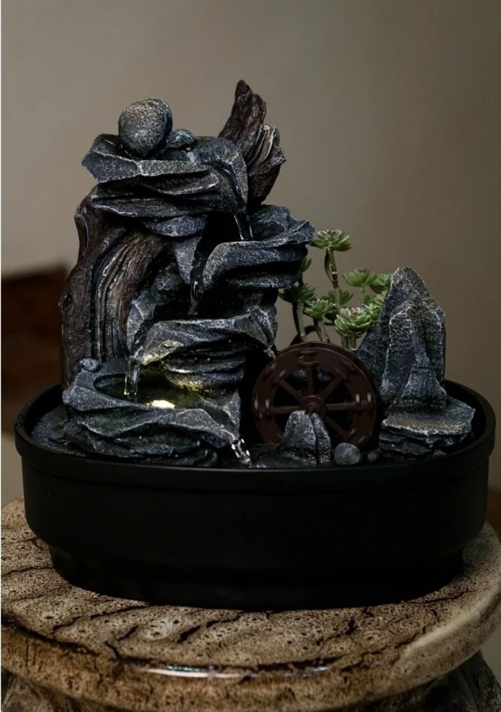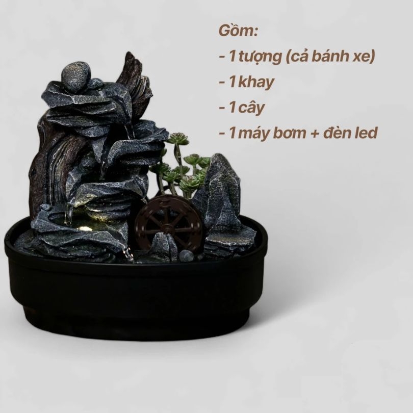 Thác Nước Phong Thủy Mini TNMKB13 gây ấn tượng với tạo hình vách đá tầng tầng, dòng nước chảy qua bánh xe nước xoay nhẹ, tái hiện khung cảnh thiên nhiên sống động. Âm thanh róc rách dịu êm giúp giảm căng thẳng, mang lại cảm giác thư thái trong suốt ngày dài làm việc.