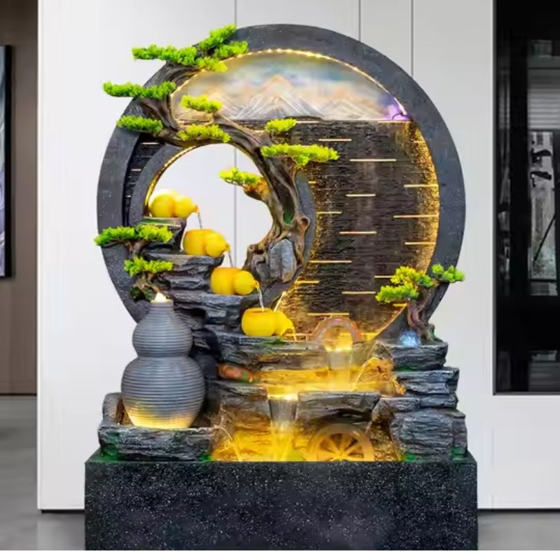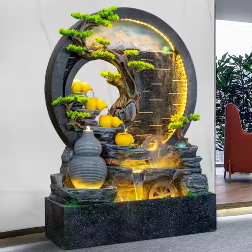 Thác Nước Phong Thủy Tài Lộc Sơn Thủy_KBPTTN040 là một thiết kế cao cấp, được chế tác tinh xảo theo thế “sơn thủy hữu tình” – hài hòa giữa núi tĩnh – nước động, giữa vật chất – năng lượng – cảm xúc. Từng chi tiết trong sản phẩm đều mang hàm ý cát lành: cây xanh tượng trưng cho sinh sôi, quả vàng biểu trưng cho phú quý, bánh xe nước là tài lộc không ngừng chảy về.